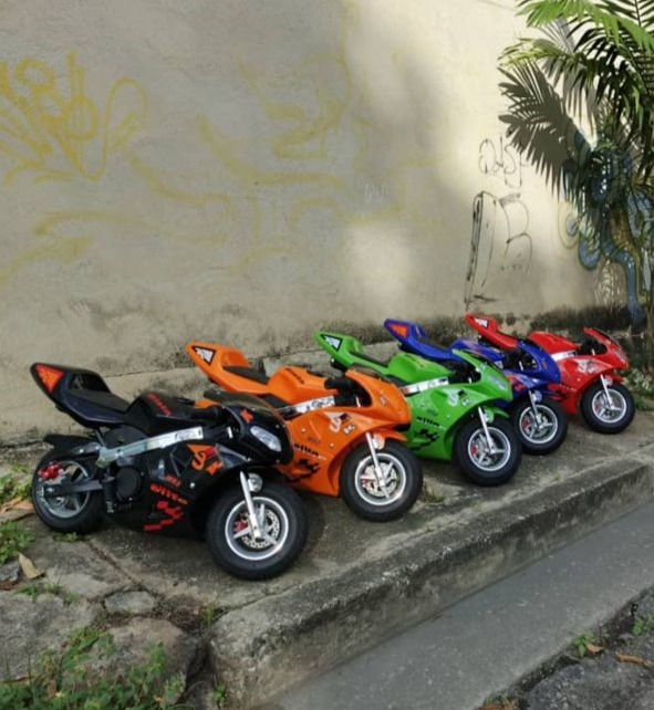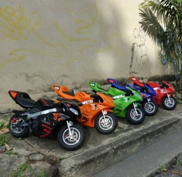Imagina ser el dueño de una de estas espectaculares Mini Motos de Carrera (Pocket Bikes). Cinco máquinas en colores vibrantes te esperan: el elegante Negro, el audaz Naranja, el llamativo Verde, el potente Azul y el clásico Rojo.